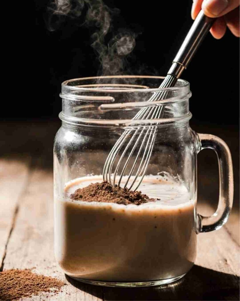 • Bloom the cocoa. Whisk cocoa powder with 2–3 tablespoons of warm milk in a jar or bowl until smooth.