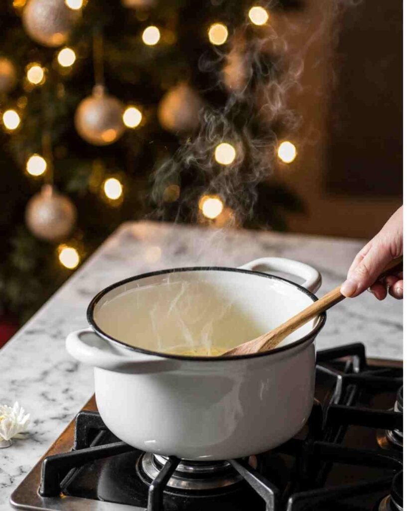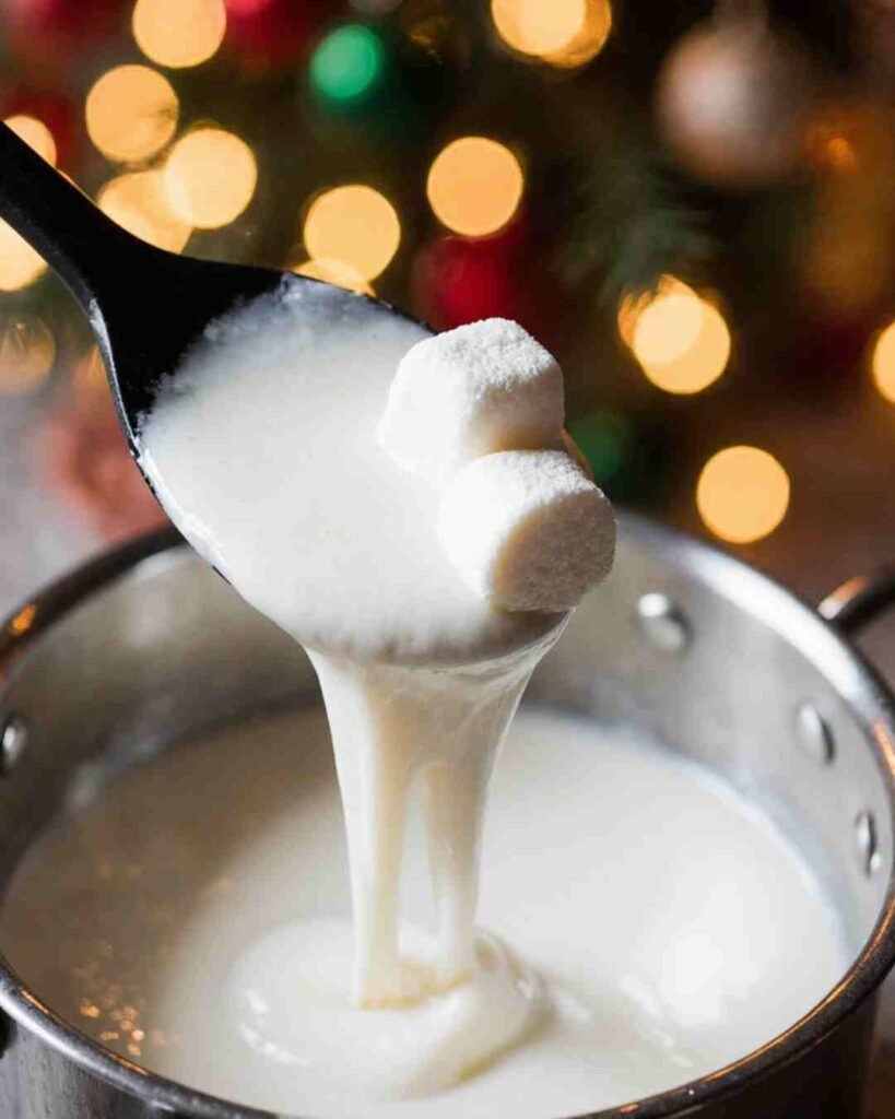 Pour in the marshmallows and stir continuously until they’re fully melted, silky, and making your kitchen smell like Christmas itself.