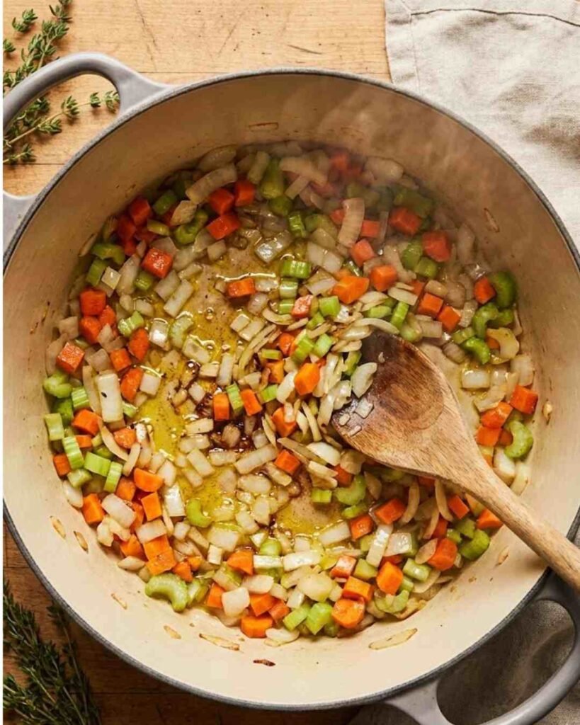 1. Heat olive oil in a large pot over medium heat. Add onions, carrots, and celery. Cook 5–7 minutes until softened.