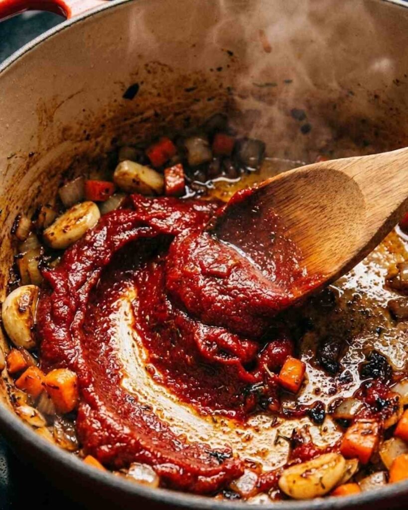 3. Stir in tomato paste and cook 1–2 minutes to caramelize and deepen the flavor.