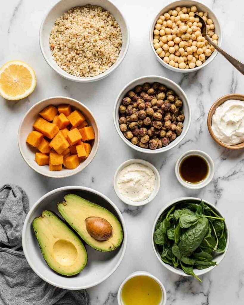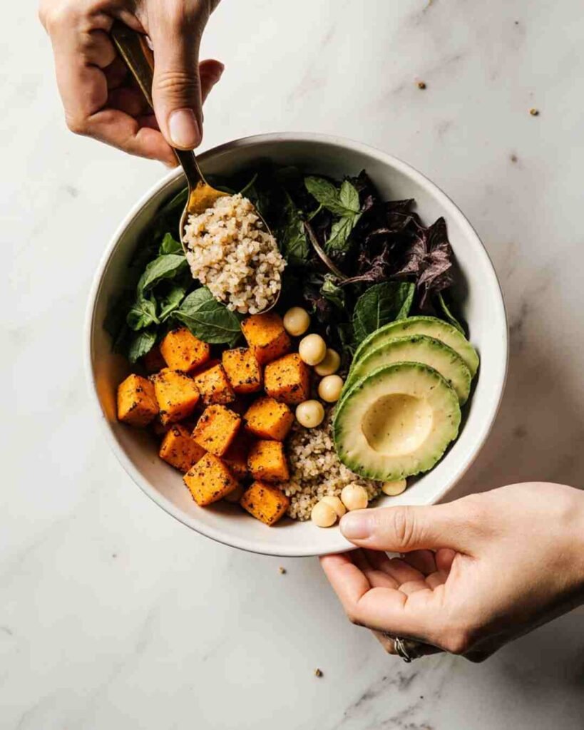 Grab your favorite bowl — the wide one that makes food look fancy. Start with your grain at the bottom, then layer in sweet potatoes, greens, chickpeas, and avocado slices. Add your eggs on top. Finish with a drizzle of olive oil or tahini, a spoon of hummus, and a sprinkle of seasoning.