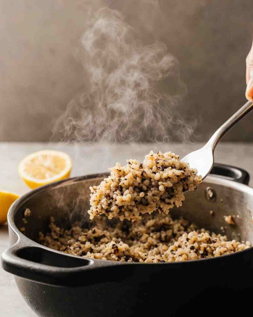 Start with your grain — quinoa, rice, or whatever you love. Cook it according to the package directions. Once it’s done, fluff it with a fork and add a pinch of salt and a squeeze of lemon juice. This tiny trick makes it taste restaurant-level fresh.