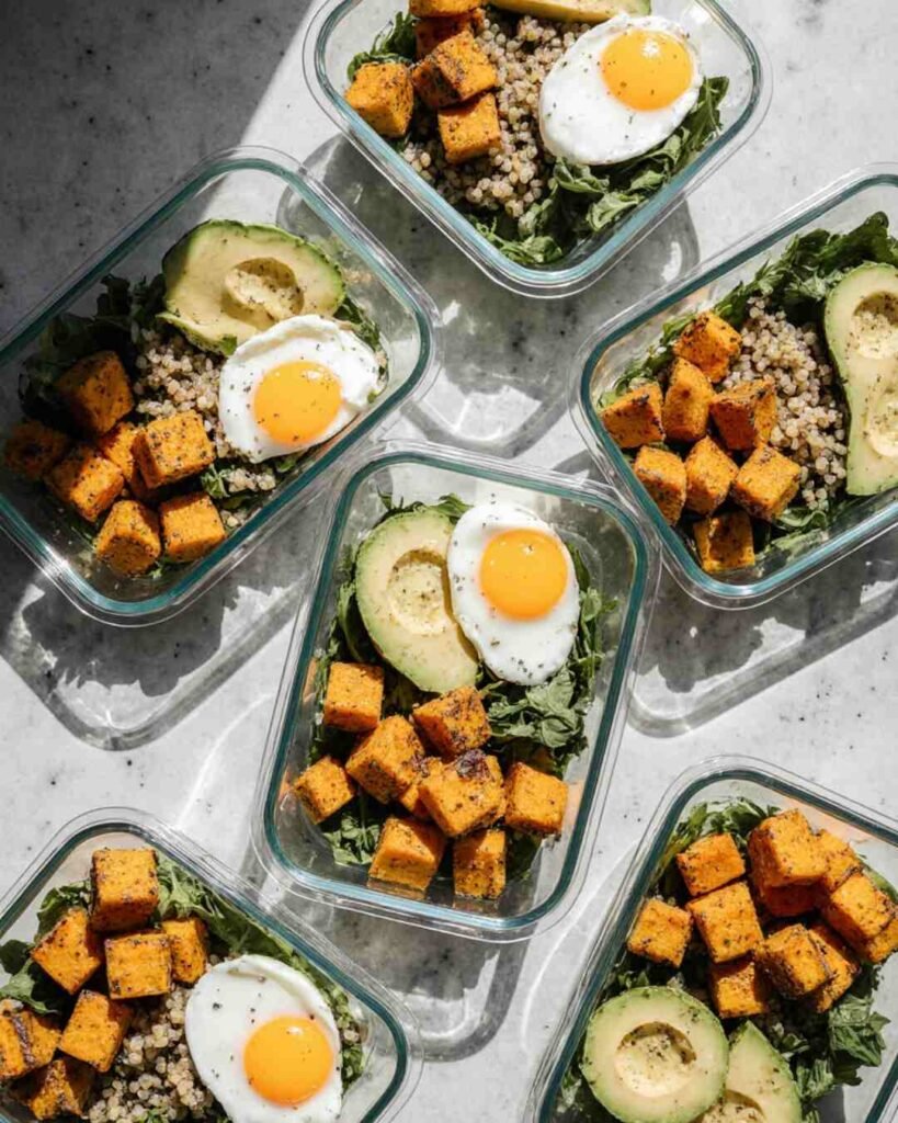 Pack everything into airtight containers. Store avocado separately to keep it from browning. These bowls keep well for 4–5 days in the fridge — that’s your weekday breakfast handled.