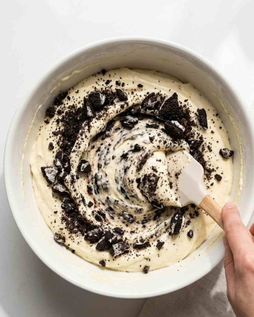 5. Fold in Oreos: Gently fold crushed Oreos into the mixture without overmixing.