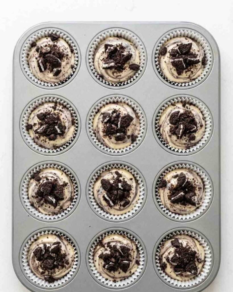 6. Fill the cups: Spoon the mixture over each Oreo base, filling liners to the top. Smooth the surface if desired.