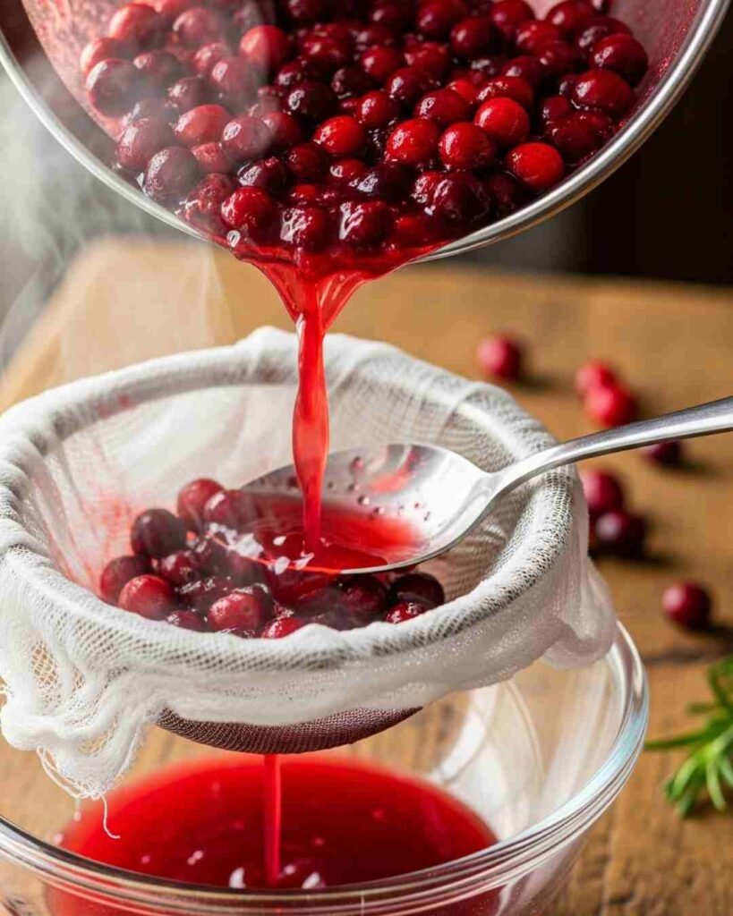 Set up a fine mesh strainer or line one with cheesecloth over a large bowl. Carefully pour the hot cranberry mix through, pressing the solids with a spoon to squeeze out every last drop of juice. What’s left in the strainer? Cranberry pulp. Don’t toss it—it can star in muffins, smoothies, or even oatmeal.