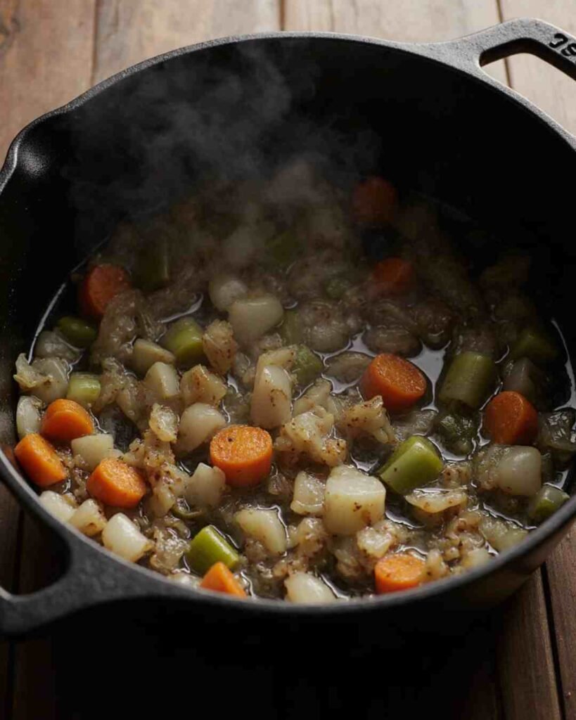- Add diced onion, carrots, and celery. Sauté 5–7 minutes until softened.