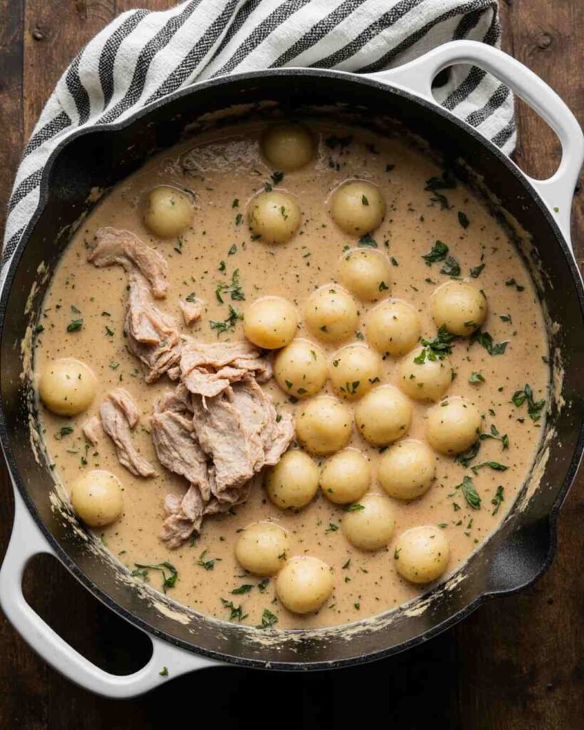 Add the shredded chicken and the gnocchi directly into the pot—no boiling needed. Let the gnocchi simmer for about 4–6 minutes. They cook fast and release starch, which thickens the sauce even more. When they float slightly and turn tender, they’re done.