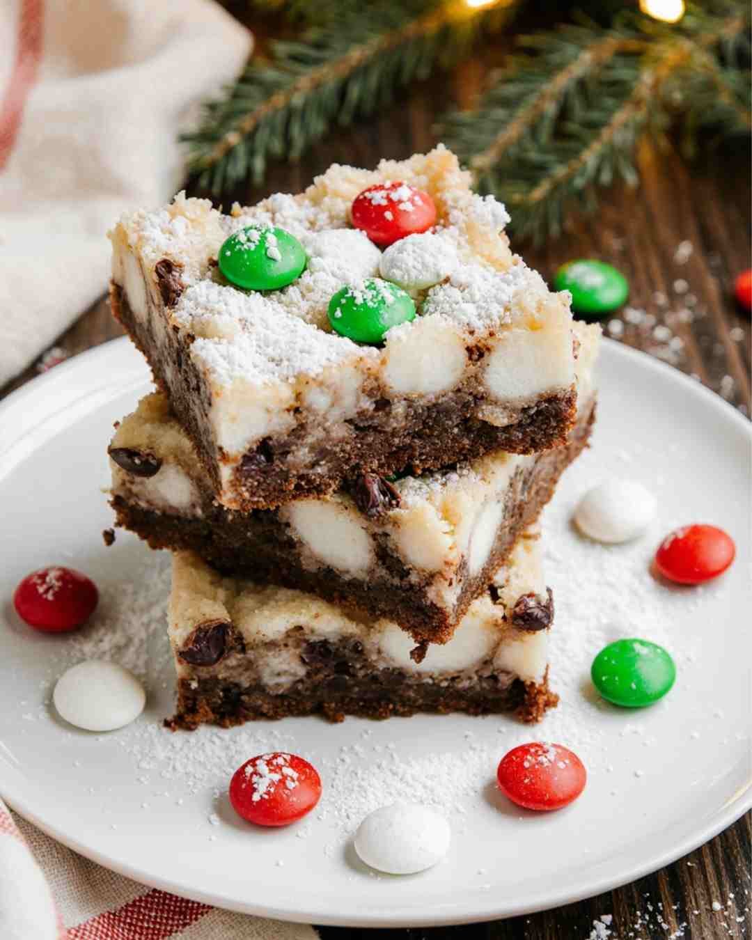 Chewy, buttery, melty chocolate, gooey marshmallows, festive sprinkles… basically Christmas cheer baked into blondie-style cookie squares. And the best part? Not a single cookie scoop in sight. No rolling. No chilling. No “why is my dough sticking to everything like holiday stress?” vibes.