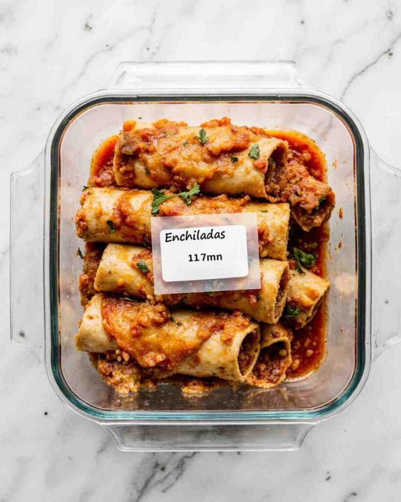 Let baked enchiladas cool completely. Transfer portions to airtight containers. Reheat in oven or microwave.